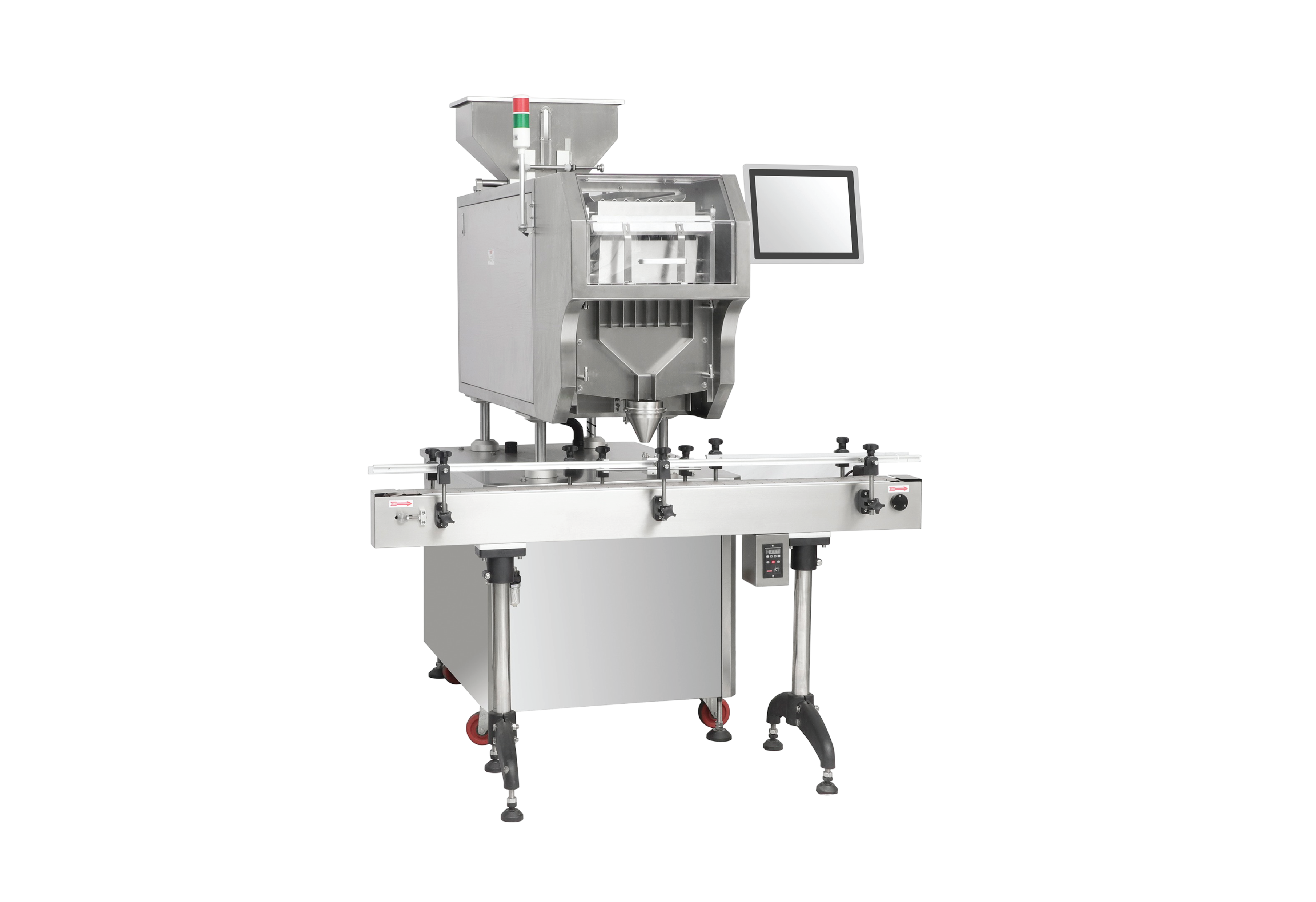 Vision-based product counter leveraging a high-speed digital camera with CCD technology and AI learning for easy changeovers. Ignores small broken pieces and handles various capsule transparencies. Counts 50–60 pieces per minute with 99.8% accuracy. Dust-resistant design; user-friendly touchscreen; simple operator controls and stainless steel frame. Eligible for trade-in, leasing or financing.